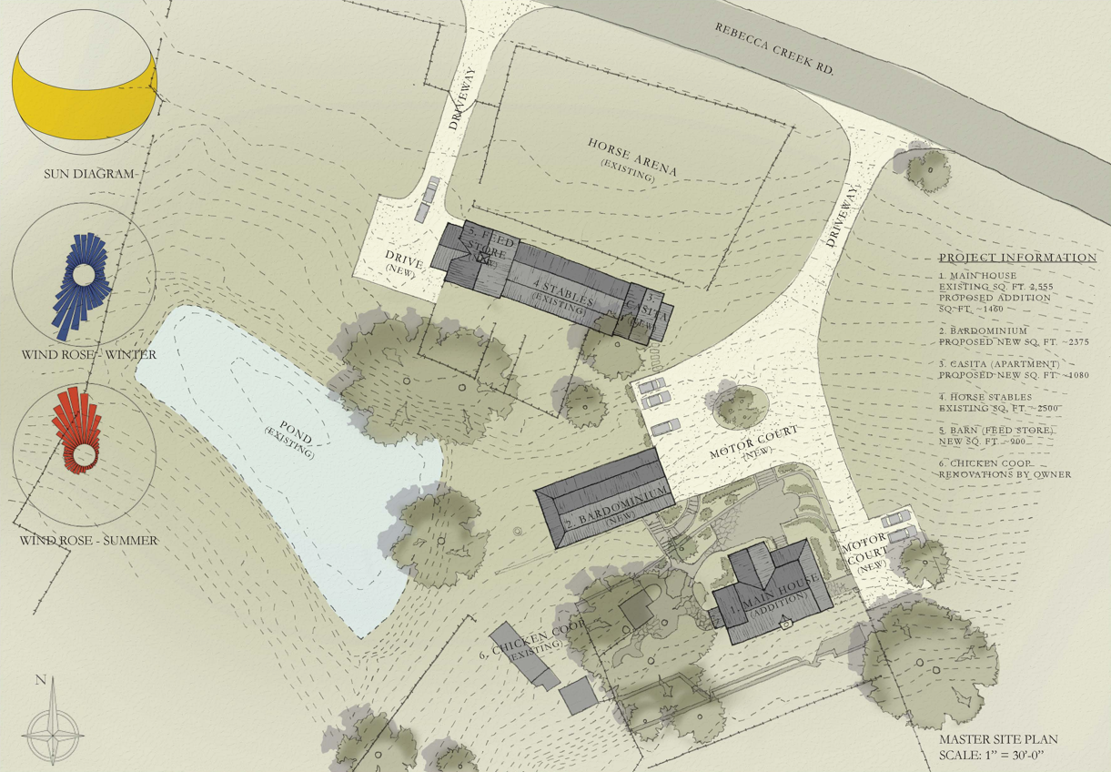 Native grasses, live oaks, and wildlife corridors are preserved wherever possible. Local stone and timber reduce environmental impact and keep the architecture connected to its setting. The plan anticipates growth in phases, ensuring the ranch can evolve while staying true to its origins.