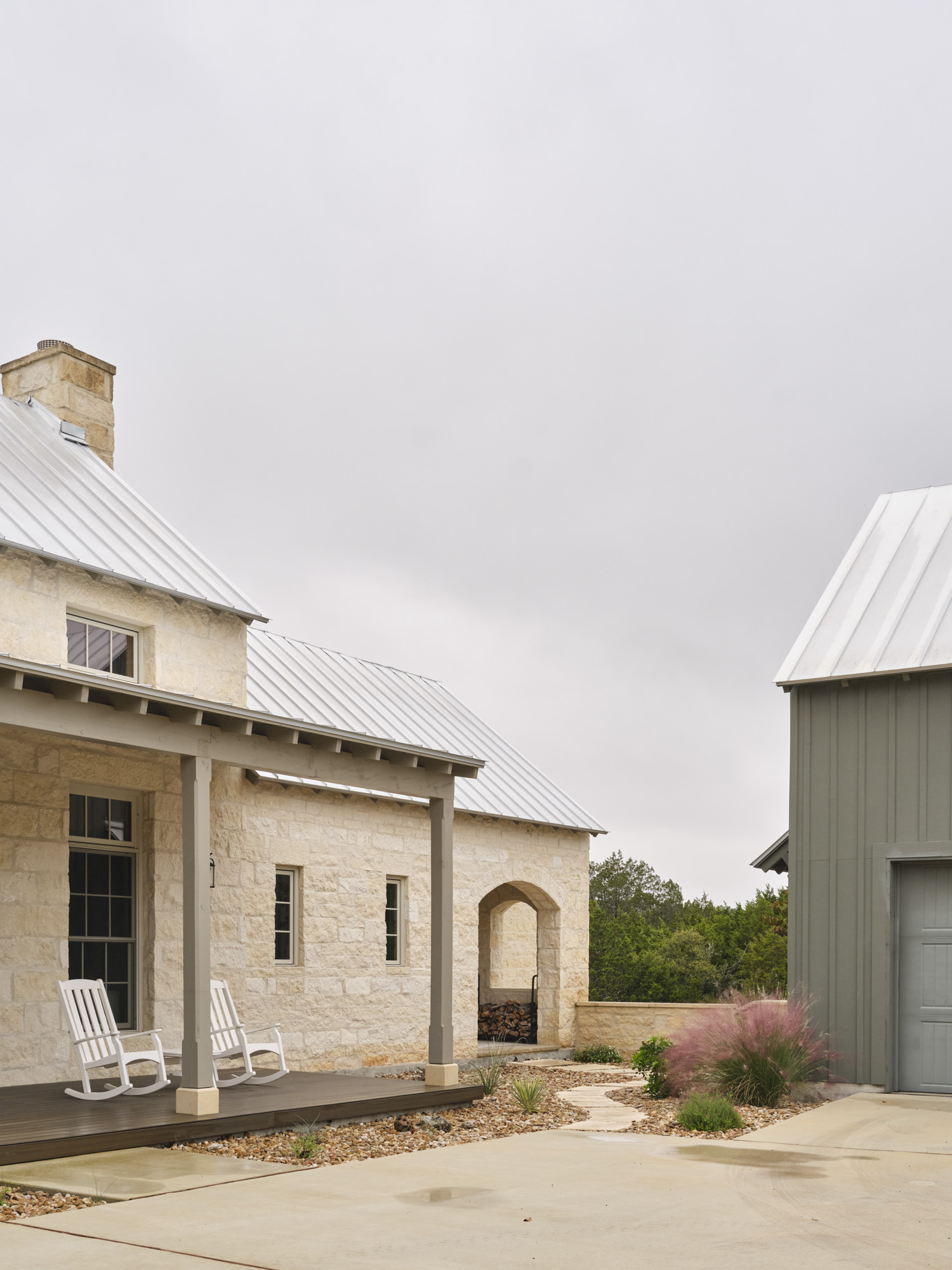Many Texas Hill Country pioneer towns were located near water sources like rivers, creeks, or springs, for agriculture and drinking water. In addition to water access, due to the hilly terrain of the region, many homes were built on higher ground, offering both protection and spectacular views. Stone houses followed the natural topography, with some built directly into the hillside or terraced to fit the environment. These patterns are mimicked in the building of the Twin Sisters Ranch, allowing the complex to seemingly sprout from the site.